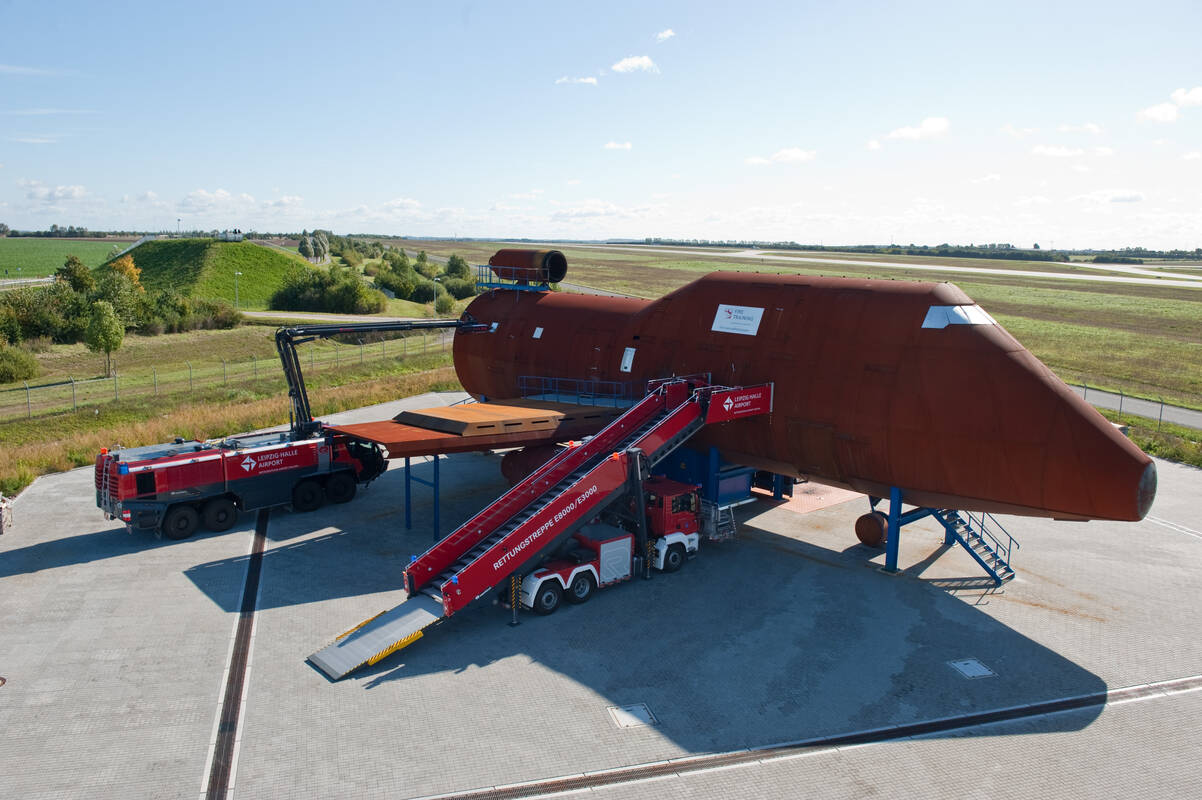 Eine weitere Option für Ihre faszinierende Tour ist ein Halt bei unserem Ausbildungszentrum Fire Training Leipzig/Halle Airport. Sie werden hautnah miterleben, wie ein Brand der Boeing Attrappe in einer Vorführung von einem „Panther“ Vorfeldlöschfahrzeug bekämpft wird. Nur auf exklusive Anfrage und mit max. 60 Personen möglich.