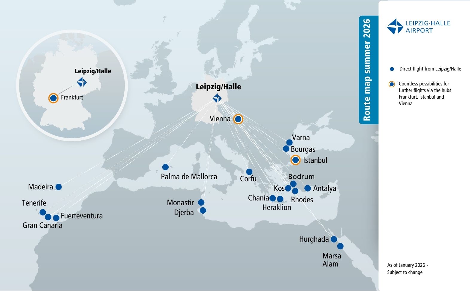 Plan your trip with the current flight schedule for Leipzig/Halle Airport! Use the practical flight search to look for specific connections and discover all direct destinations that can be reached from Leipzig/Halle. Whether you are on a business trip or vacation - with our flight schedule you are well informed and can start your next adventure in a relaxed manner.